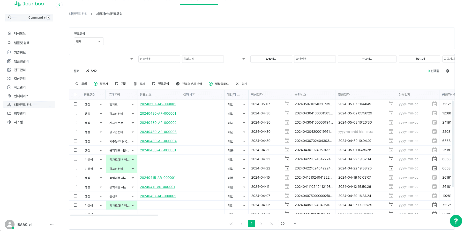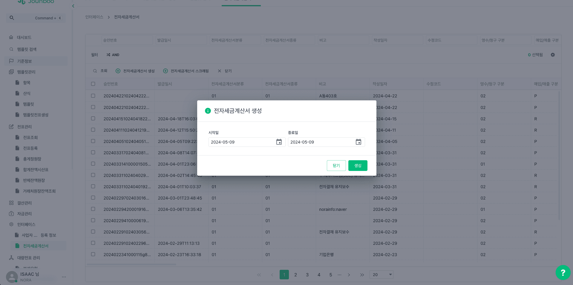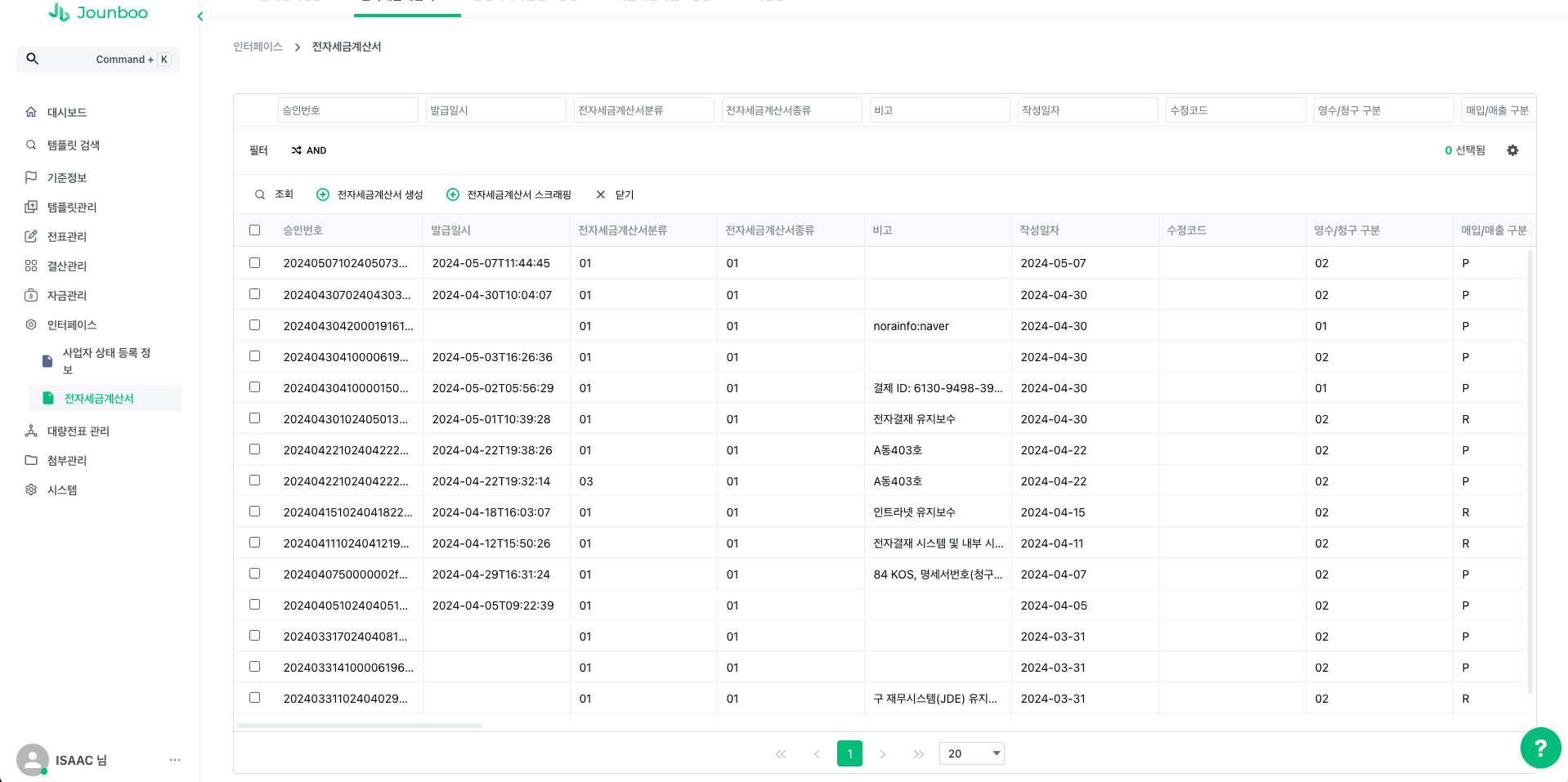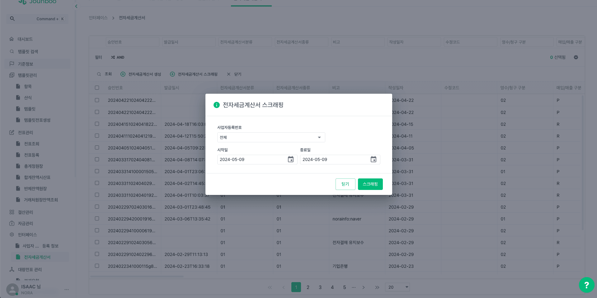 스크래핑 서버에서 세금계산서전표생성 내역으로 가져옵니다.